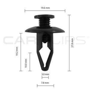 Ford/Hyundai/Kia/Mazda/Nissan Car Clip Code: CC10109/10 Nissan/Ford/Hyundai/Kia/Mazda Multi Purpose clip Ford Part numbers; MNA01-56145; MNA0156145; NA01-56145; NA0156145 Hyundai Kia part number; MNA0156145; Mazda part number; NA01-56145 Nissan part number; 63844-01A00 Black Fits 8mm hole Very popular Scrivet clip. Typically used on loose fitting panels and these are commonly used on some cars to attach wheel arch linings, splashguards and other protective panels. Most often used on the Inner fender area. Location; Baffle. Engine, Cowl, Rocker moulding, Seal plate, splash guard, Wheel well, Mud flap and Fender clip Commonly found on most models including; - Nissan 200SX - Nissan 300ZX - Nissan Bluebird - Nissan Elgrand - Nissan Fairlady - Nissan Liberty - Nissan Lucino - Nissan Maxima - Nissan Micra - Nissan Navara - Nissan Pathfinder - Nissan Prairie - Nissan Primera - Nissan Pulsar - Nissan Sentra - Nissan Silvia - Nissan Sunny - Nissan Sylphy - Nissan Teana - Nissan Terrano - Nissan Tiida - Kia Carnival - Mazda 3 - Mazda 323 - Mazda 6 - Mazda 626 - Mazda Atenza - Mazda Axela - Mazda Capella - Mazda Cosmo - Mazda CX-7 - Mazda Eunos - Mazda Familia - Mazda MPV - Mazda MX-5 - Mazda Premacy - Mazda RX-7 Compares with; - Wurth 150159598 - Autoclips AC818 - Auveco 16858 - CarKlips CK0480 - P247-494